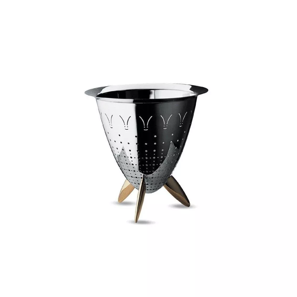 Alessi Colander Max le chinois Code: 90025 Designer Philippe Starck Colander in 18/10 stainless steel mirror polished outside, mat finish inside. Feet in brass casting. Philippe Starck's designs for Alessi have steadily assumed the look and name of lively presences on the domestic front: the "Max le chinois" colander is an ironic object that takes its place in the rituals of cooking. It's big, beautiful and expensive because of its aesthetics: but its design has a strong impact, which you can't say for any other colander. Diameter (cm): 30.00 Height (cm): 29.00