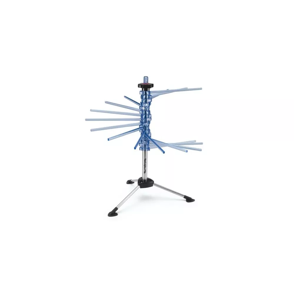 Tacapasta Drying Rack, Marcato Design Line Tacapasta, from the Marcato Design line, is the ideal accessory for drying pasta. It is available in four beautiful colors: blue, yellow, black, and red. Equipped with 16 sturdy arms, it can support up to 2 kg of pasta. The multi-purpose wand, inserted into the central column, allows you to collect freshly cut pasta and easily hang it on the Tacapasta. Tacapasta opens in a fan shape and closes quickly, taking up very little space. Its original design fits perfectly in the kitchen, making it the ideal accessory to pair with Marcato's Atlas and Ampia lines. Highly functional and easy to use, Marcato's Tacapasta is the perfect gift for anyone who loves homemade fresh pasta. Important: 1. Do not wash in the dishwasher. 2. Do not clean with metal objects. 3. Clean with a toothpick or brush. **Dimensions:** 420 x 420 x 460 mm **Weight:** 0.7 kg