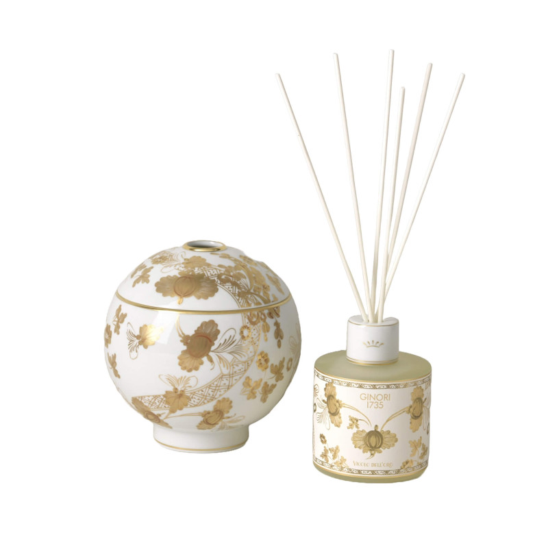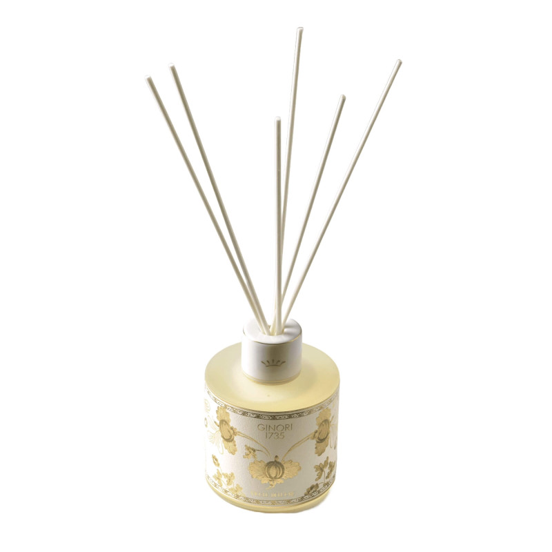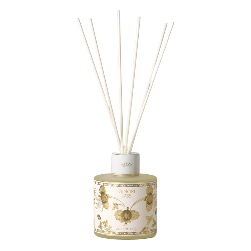 Perfume Diffuser with Sticks, Aurum Oriente Italiano - Richard Ginori 1735. Fragrance Family: FLORAL, MUSKY Olfactory Pyramid: Top Notes: Bergamot, Green Mandarin Heart Notes: Peony, Pittosporum Base Notes: White Musk, Cedarwood Discover the new Aurum and Rubrum colors in the Oriente Italiano Gold Collection, both crafted with zecchino gold, one with a white hue and the other with a vibrant red shade. With the Oriente Italiano collection, Ginori dared to create a lush and vibrant garden of exotic flowers, an exuberant and unusual celebration on the meadow. Merging two elements of Italian artistic tradition: the elegance of the lines from the Antico Doccia Ginori collection and the delicate charm of the Carnation, a typical floral motif found in Faenza ceramics, inspired by an imaginary oriental garden. These elements combine with explosive colors that bring to life the porcelain plates, cups, and all other items in the Ginori Oriente Italiano collection. Please note that items in this collection with gold filigree are not suitable for use in the microwave or dishwasher, but only with a delicate cycle. DISCOVER THE COLLECTION: Oriente Italiano