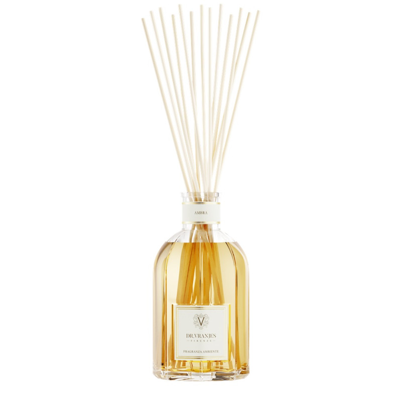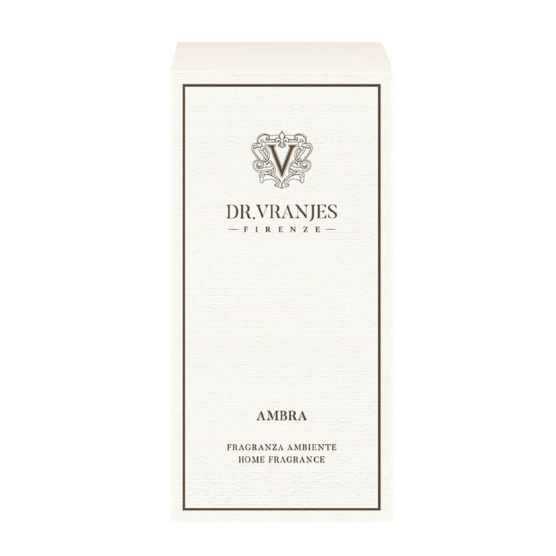 In the home fragrance Ambra, the fascinating mystery of the Orient gives relaxation to living spaces and bedrooms, adorning them with a pleasant and charming sensation. The elegant amber and patchouli base develops with the intense notes of sandalwood and vanilla. Olfactory Pyramid: Amber, Patchouli, Sandalwood Area: day, night SIZE: 100 ML: ideal for very small spaces. Size: Ø 5.6 cm x H 11.7 cm, with sticks H 17 cm 250 ML: ideal for spaces from 5 to 10 sqm. Size: Ø 7.4 cm x H 15.2 cm, with sticks H 34 cm 500 ML: ideal for spaces from 10 to 20 sqm. Size: Ø 9.1 cm x H 19 cm, with sticks H 40 cm 1250 ML: ideal for spaces from 20 to 30 sqm. Size: Ø 12 cm x H 24 cm, with sticks H 54 cm 2500 ML: ideal for spaces from 30 to 50 sqm. Size: Ø 15 cm x H 30.5 cm, with sticks H 60 cm 5000 ML: ideal for spaces from 10 to 20 sqm. Size: Ø 18.2 cm x H 37 cm, with sticks H 70 cm