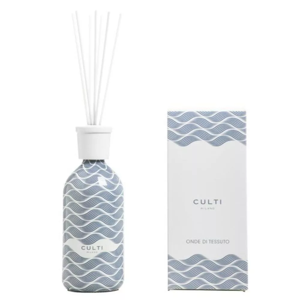 The Onde di Tessuto diffuser by Culti Milano is a fresh take on the iconic Tessuto fragrance. Inspired by flowing fabric in a seaside summer breeze, it evokes comfort, lightness and elegance.