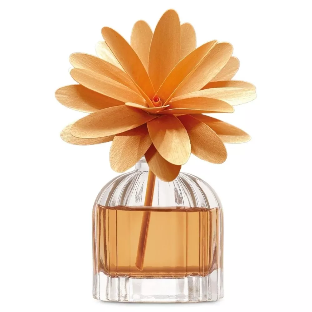 A refined home fragrance in a glass bottle with a handmade birch wood flower diffuser. The Cedar and Bergamot scent conveys the vibrant energy of citrus, with sunny notes of orange peel and mandarin that warm the atmosphere like a September sun. A luminous and revitalizing essence that brings well-being and harmony to any space.