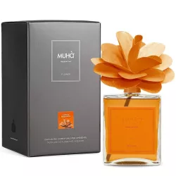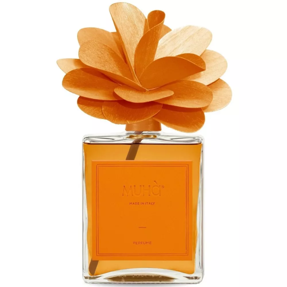A refined home fragrance in a glass bottle with a handmade birch wood flower diffuser. The Cedar and Bergamot scent conveys the vibrant energy of citrus, with sunny notes of orange peel and mandarin that warm the atmosphere like a September sun. A luminous and revitalizing essence that brings well-being and harmony to any space.
