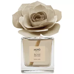 A refined home fragrance in a glass bottle with a handmade birch wood rose-shaped diffuser. The Dolce Latte scent conveys the perfect balance between boldness and delicacy: sparkling, sweet top notes lead to a floral and fruity heart, while a warm, sensual base of musk, tonka bean, and vanilla envelops the room. A soft, sophisticated essence that creates a welcoming and elegant atmosphere.