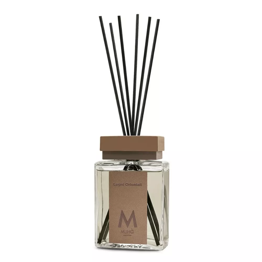 The Bastoncino line by Muhà represents the excellence of Italian design, combining aesthetics with functionality. The glass bottle is enhanced by a handcrafted zama neck and an eco-leather label that adds a sustainable, refined touch. The fiber reeds ensure even diffusion, turning any room into an atmosphere of sensory luxury.