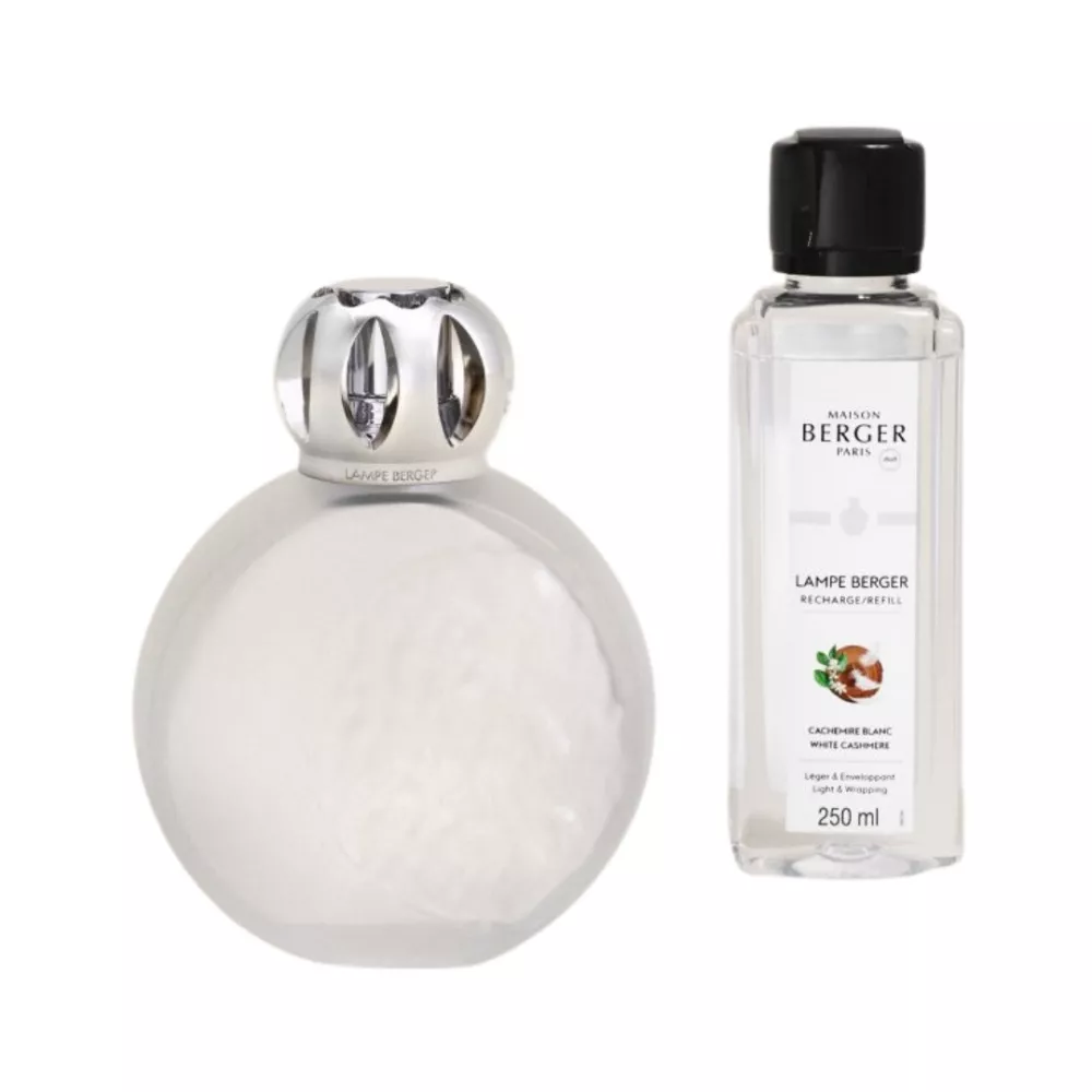 The Astral Givrée Lamp from the Astral collection embodies sophistication and elegance with its contemporary design. Crafted from lacquered glass in frosted tones and enhanced with a silver sphere frame, it adds a luminous touch to modern interiors. Included is the Cachemire Blanc fragrance, a delicate and sensual scent that creates a warm, inviting atmosphere. Both decorative and functional, this catalytic lamp purifies and perfumes the air, making it the perfect gift for lovers of luxury and refined design.