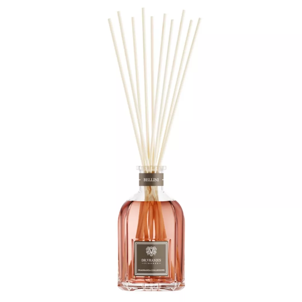 In the flowery and fruity Bellini fragrance, the sweet and delicate notes of fruit harmonise with the elegant accents of flowers and the rich background of ginger and vetiver. Olfactory Pyramid: White grape, Peach, Ginger Area: perfect to adorn living spaces and give a pleasant, sparkling atmosphere SIZE: 100 ML: ideal for very small spaces. Size: Ø 5.6 cm x H 11.7 cm, with sticks H 17 cm 250 ML: ideal for spaces from 5 to 10 sqm. Size: Ø 7.4 cm x H 15.2 cm, with sticks H 34 cm 500 ML: ideal for spaces from 10 to 20 sqm. Size: Ø 9.1 cm x H 19 cm, with sticks H 40 cm 1250 ML: ideal for spaces from 20 to 30 sqm. Size: Ø 12 cm x H 24 cm, with sticks H 54 cm 2500 ML: ideal for spaces from 30 to 50 sqm. Size: Ø 15 cm x H 30.5 cm, with sticks H 60 cm 5000 ML: ideal for spaces from 10 to 20 sqm. Size: Ø 18.2 cm x H 37 cm, with sticks H 70 cm