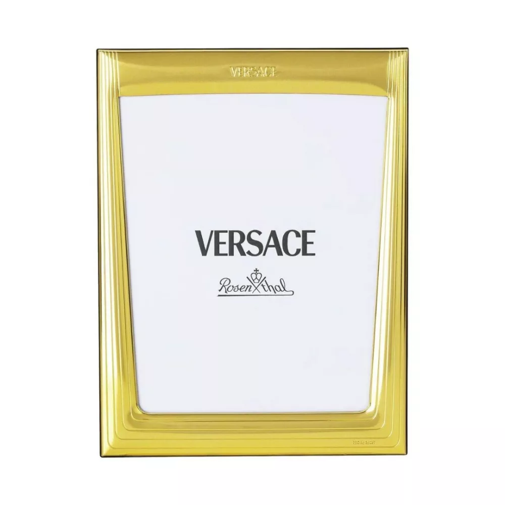 The Versace Frames VHF14 Gold photo frame embodies luxury and refinement in a sleek rectangular design. Crafted from laminated silver and embellished with the golden VHF14 decoration, it preserves your most treasured memories while serving as a sophisticated decorative piece. With its elegant aesthetic and Italian craftsmanship, it is perfect for enhancing both modern and classic interiors, showcasing the timeless prestige of the Versace Maison.
