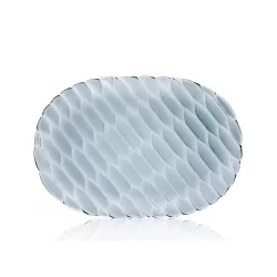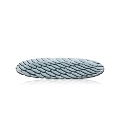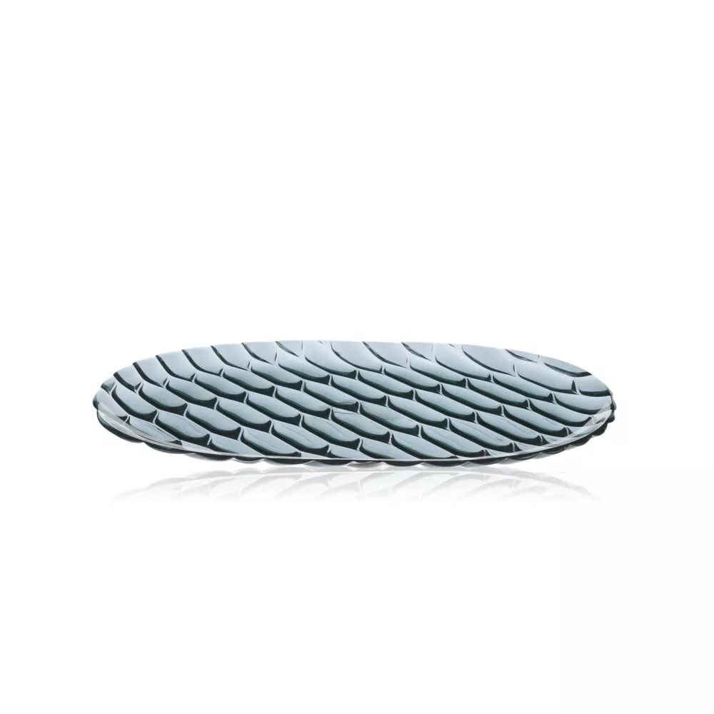 36 CM OVAL TRAY, JELLIES FAMILY 1580 - KARTELL This line of plates, trays, glasses, bowls, and carafes offers a wide selection of products made from brilliant, colored, and transparent PMMA. What makes this line unique is that each design features a different pattern inspired by nature and organic shapes, reminiscent of traditional molds used for making jellies in kitchens. These patterns highlight the temporality and variety that characterize each stage of the meal, from the initial course to the final one. The delicate, soft, and easily combinable transparent colors allow for setting vibrant tables, whether they be creative and original or more classic and monochromatic. Dishwasher safe Dimensions: Length: 36.5 cm Width: 25 cm DISCOVER THE COLLECTION: Jellies Family Kartell