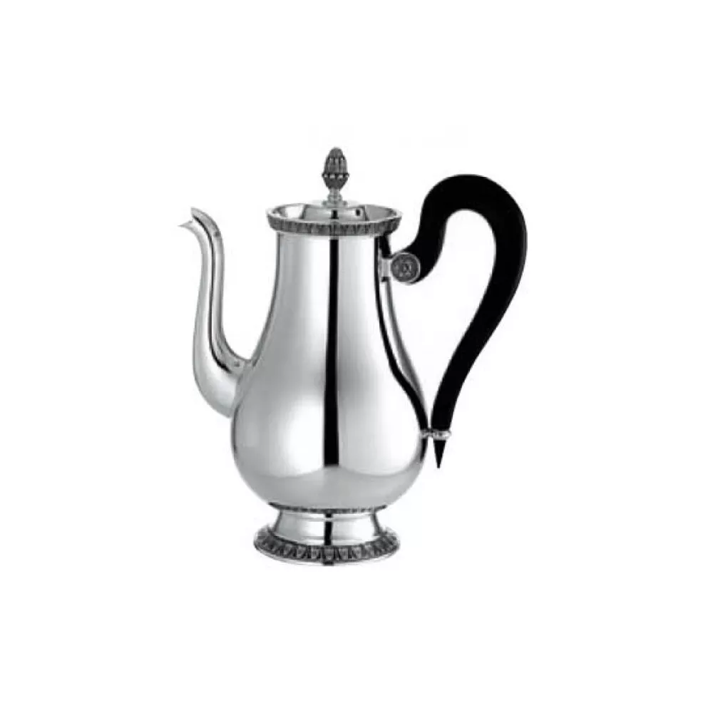 Christofle Malmaison Silver Plated Eight-Cup Coffeepot This silver plated Malmaison coffeepot, which has an eight-cup capacity and a striking ebony wood handle, adds refinement and elegance to any coffee service or brunch. Especially when it is paired with the cream pitcher and sugar bowl. One of Christofle's most historic patterns, Malmaison typifies the Empire style, with its frieze of delicate palm and lotus leaves and symmetrical design. The name is a nod to the Chateau de la Malmaison, a favored Parisian residence of Napoleon Bonaparte and Empress Josephine. Malmaison, one of Christofle's most historic patterns, is in the Empire style. The frieze of delicate palm & lotus leaves is typical of this style. MATERIAL • Silver Plated DIMENSIONS • Capacity: 8 cups