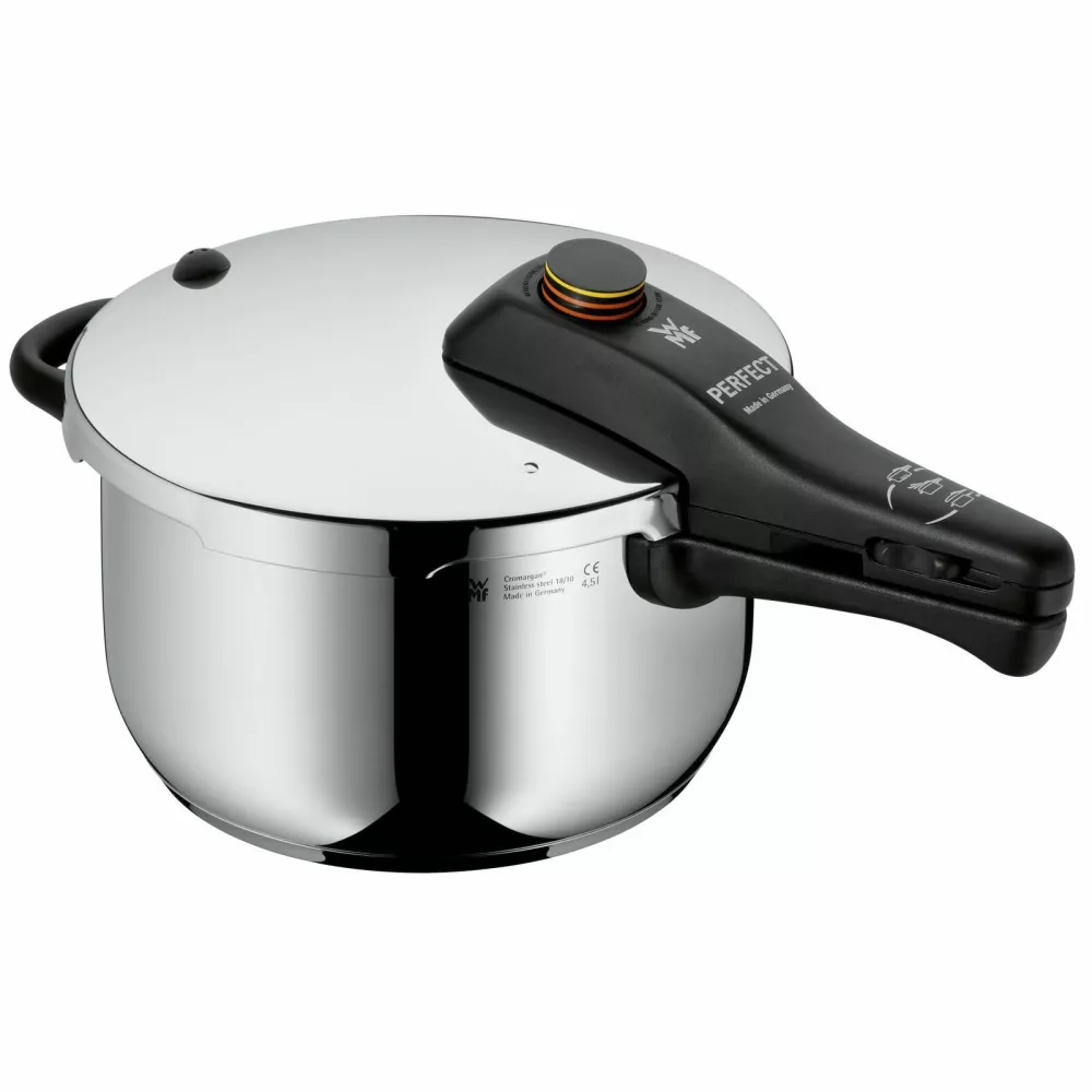 Perfect Code: 9262 Pressure cooker without insert 4.5l; Ø 22 cm - item number: 0792629990 TÜV tested safety: Automatic steam release and remaining pressure safety provide safety for opening. Made in Germany - Premium quality, produced in-house in Germany. 3-Year warranty for all WMF pressure cookers. Scaling on the inside makes measuring amounts easier. Colour coded doneness indicator. 2 fixed adjustable cooking settings (110°C/119°C). One-hand cooking level control for easy operation. Removable lid handle for simple and easy cleaning. Maintenance-free valve system. Material: Cromargan Stainless steel rust-free 18/10 polished - dishwasher safe, easy to clean, tasteless and acid resistant. Pan and lid dishwasher safe. Sealing ring and lid handle: Hand-wash. Suitable for all stove types, including induction ovens. TransTherm-Allherdboden: Patented floor construction with even heat distribution and extended heat storage for energy efficient cooking.