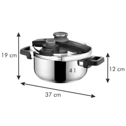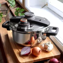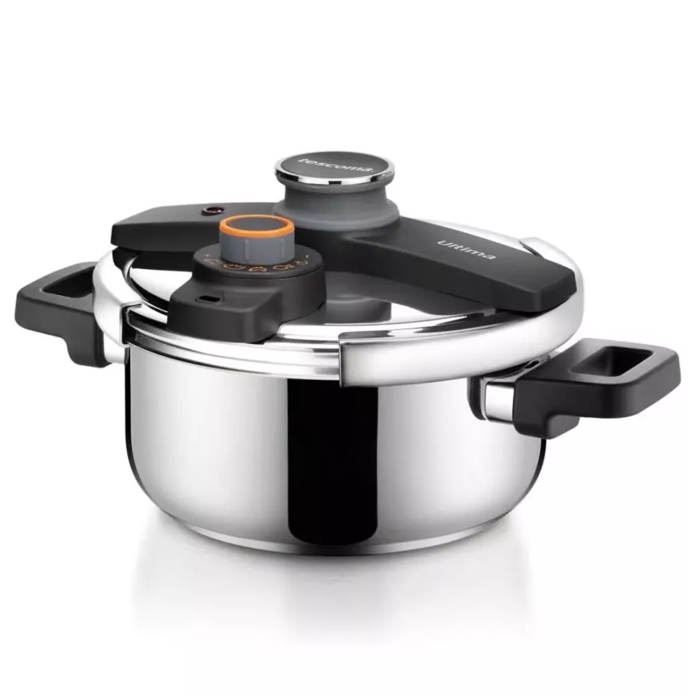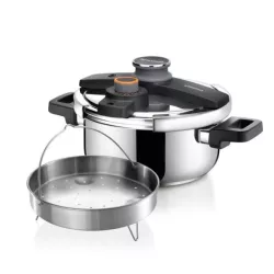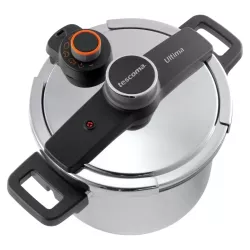 The Ultima pressure cooker by Tescoma offers a fast, safe and energy efficient way to prepare a wide range of dishes. The innovative IdealCook pressure regulator clearly indicates the correct pressure level depending on the food being cooked, including meat, fish, game, soups and vegetables, ensuring precise and consistent results. Equipped with four safety devices and a convenient one hand closing system, it provides excellent ease of use while cooking. Made of stainless steel with a sandwich base suitable for induction hobs, it also includes a basket for versatile cooking. By using the universal glass lid available separately, the pot can also be used as a regular casserole.