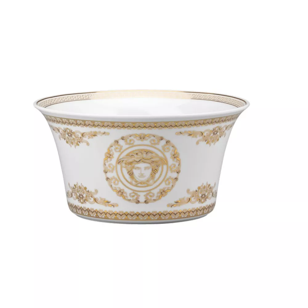 One of the first sets of the collection "Rosenthal meets Versace”, the décor "Medusa” by Gianni Versace on the form of the "Ikarus” mirrors the matchless rich, color intensive world of Versace. Central eye-catcher of this collection is a glorious gold colored head of Medusa, an unmistakably Versace emblem, framed by expressive baroque ornaments. The centrally placed head of Medusa decorates all cups, pots, service and breakfast plates of the collection "Medusa”. Varacious aristrocratic colors, bright red, precious gold and black with lavish delicate designs and ornaments give the head of Medusa a colorful elegant framework. Material: porcelain Diameter: 20 cm Capacity: 1,66 l