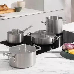 Set composed of a 20 cm pot, a 20 cm two-handled saucepan, a 24 cm low two-handled saucepan, a 16 cm long-handled saucepan, and 3 lids measuring 16, 20, and 24 cm. Convivio is born from a dialogue between the Pritzker Prize winner David Chipperfield and the Michelin-starred chef Pietro Leemann, whose different skills have come together in the design of this collection. Trilayer (AISI 430, aluminum, 18/10 stainless steel) Pack of 7 pieces Suitable for gas, electric, glass-ceramic, and induction cooking Dishwasher safe