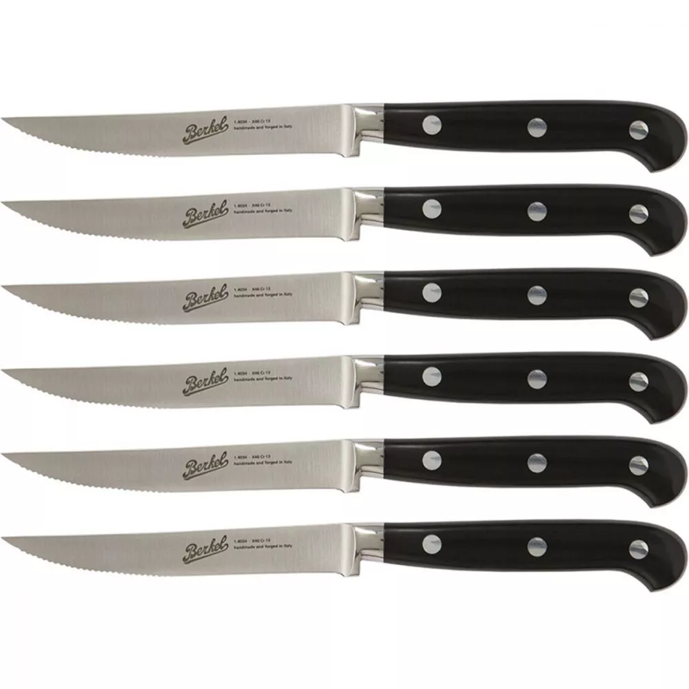 This short steak knife is easy-to-handle with a serrated blade that slides in stainless steel over the meat giving a clean and precise cut thanks to its sharpness. This set of meat knives is designed to resist corrosion and rubbing with the plate's ceramic, making them perfect for daily use. Sku: KAD6DT11SRBGB Set of 6 Steak Knife Edge: Serrated, toothed Total lenght: 215 mm Blade material Forged Stainless steel 1.4034 X46 Cr 13; Hardness after heat treatment:53-54 HRC; Certificate Catra: Good; Rivets: Stainless steel AISI 303 DISCOVER THE COLLECTION: AdHoc Knives | Berkel
