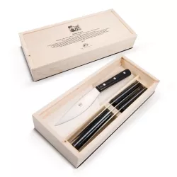 The table knife from the Valdichiana Collection asserts its presence on the table thanks to its slightly generous proportions. Its design echoes the lines of the Pontormo Knife and represents a reproduction of a knife depicted in the painting "The Supper at Emmaus" by the painter Jacopo Carucci, known as Jacopo da Pontormo or simply Pontormo, exhibited at the Uffizi Gallery in Florence. It is particularly suitable for cutting large pieces of meat. The smooth blade allows for proper cutting of food on the table, preserving its flavor and appearance. Comes in an elegant wooden box of 4 pieces. Description: Pack of 4 steak knives with black plastic handle Code: 630 EAN: 8021555006301 Blade Length: 14.1 cm Category: Table knives Suitable for: Meat Material: Stainless steel and Black Methacrylate Blade Type: Laser-cut blade Handle Type: Full tang Handle: Methacrylate - Black Handle Finish: Glossy Blade Finish: Satin Blade Material: Stainless steel Pieces per pack: 4 Size: 25.2 cm Blade Length: 14.1 cm Weight: 306 g, 440 g