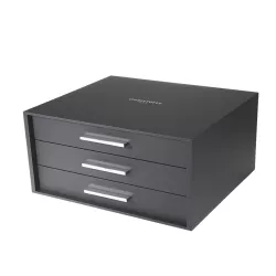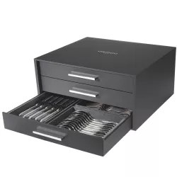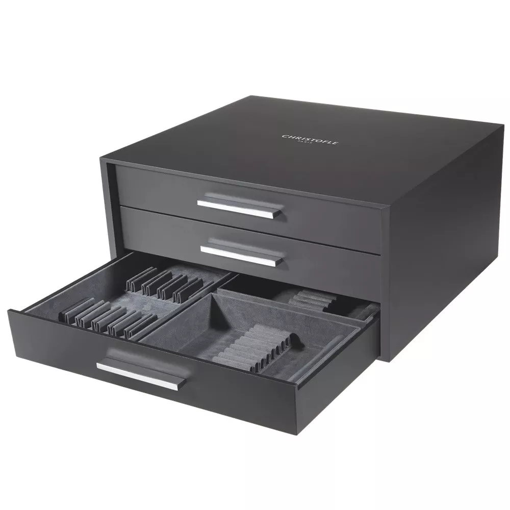 An elegant solution for storing Christofle cutlery safely and stylishly. This cutlery storage chest features 3 drawers with 10 included modules, designed to hold a 110-piece set. It has a maximum capacity of 120 individual pieces or 108 pieces with an easel, plus 1 module for serving pieces.
