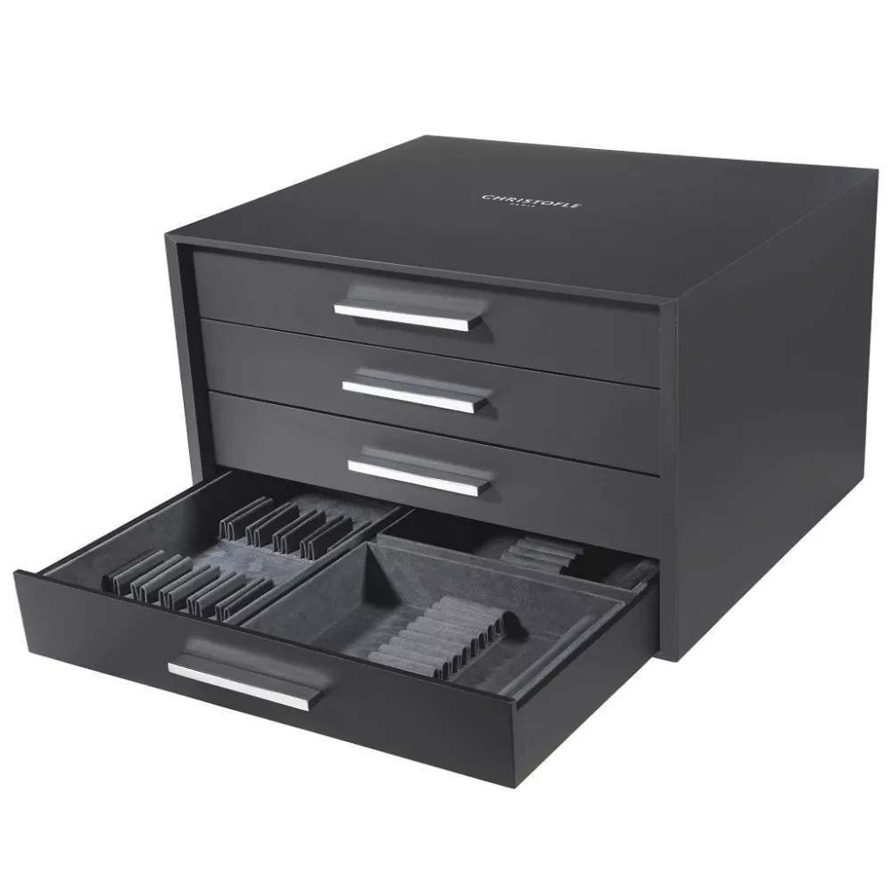 This elegant storage chest is designed to store and protect your cutlery, featuring 4 drawers with included modules. It can accommodate up to 168 individual pieces (with racks) or 156 pieces (with racks) + 1 module for serving pieces (without easel). Each module comes with removable racks to securely store your cutlery, preventing scratches. The versatile modules can either be stored in the Christofle storage box or easily placed inside kitchen drawers or other furniture.