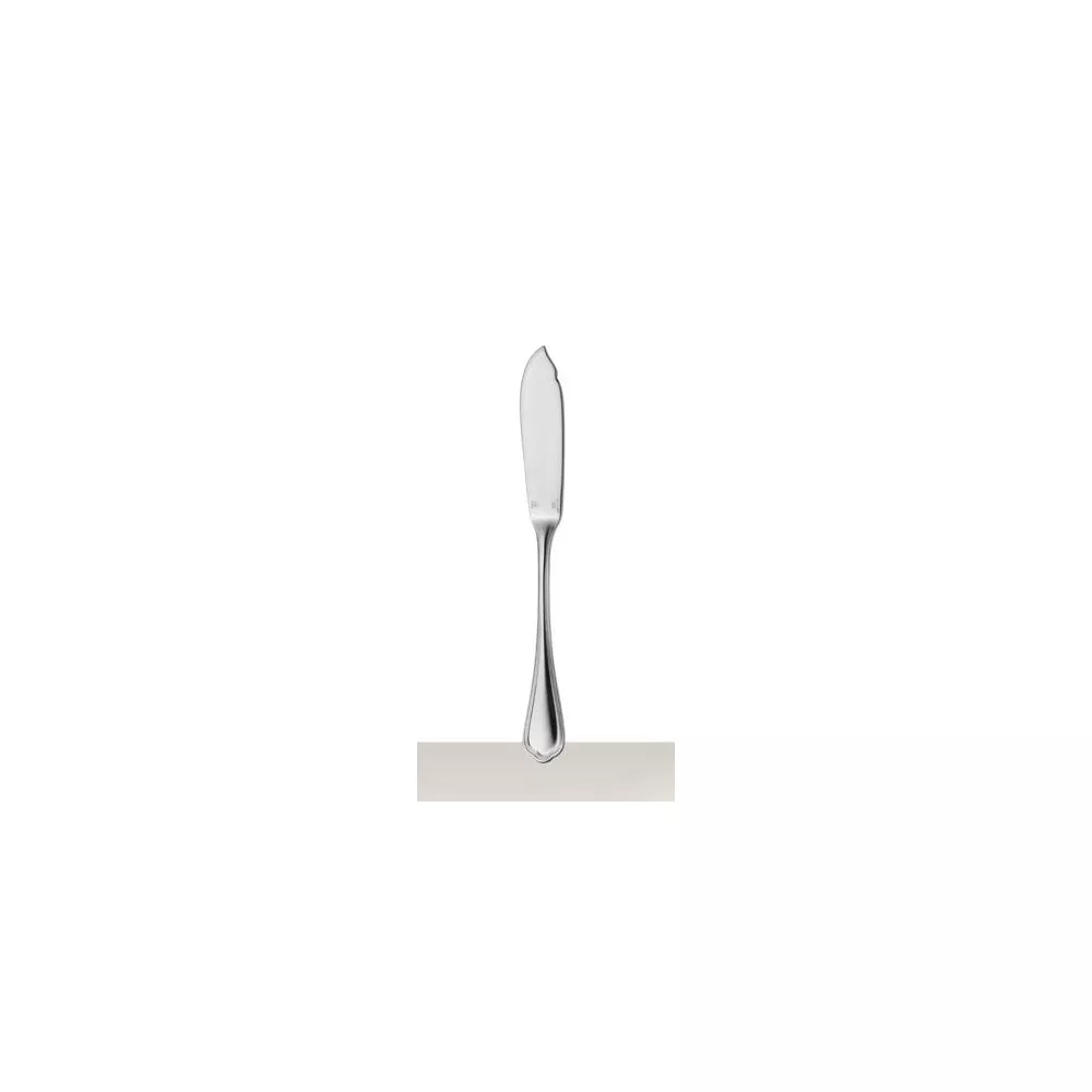 Christofle Spatour Silver Plated Fish Knife The silver plated fish knife in the Spatours pattern can be used in conjunction with a fish fork to easily separate meat from fish bones. Reflective of its 19th century roots, the Spatours collection, which was available in the first Christofle catalogue in 1862, features generous curves, decorative heels and a slender rounded ridge common in Louis XV style. Launched in 1862, the slender ridge & curve were common decorative elements in the Louis XV style of the eighteenth & nineteenth centuries. MATERIAL • Silver Plated DIMENSIONS • : 20 cm