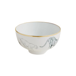 Porcelain bowl, Félins decoration, and celadon interior. Screen-printed and hand-applied decorations. Hand-applied 24-carat gold finish with a brush. To adorn the Carnets d’Équateur collection designed by the naturalist artist Robert Dallet, a nature both bustling and quiet that celebrates animal beauty. This set consists of 41 references imagined for lunch, dinner, tea/coffee, and as decorative objects. Manufactured in France Designed by Robert Dallet Height: 6 cm | Diameter: 12 cm Sku: P038186P