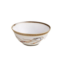 Porcelain rice bowl Screen-printed decorations applied by hand. Finish in 24-carat gold applied by hand with a brush. The Cheval d’Orient collection pays tribute to the equestrian origins of Hermès and, drawing inspiration from Persian miniatures of the 15th and 16th centuries, evokes the caravans of the Silk Road and the conviviality of the East. It is the result of an extraordinary technical feat: the use of 29 colors on each of the different decorations that adorn the 55 references imagined for lunch, dinner, tea/coffee, and decorative objects. Cheval d’Orient revisits the shapes and sizes of the great classics of Western tableware, such as with the pedestal cup or the soup tureen with elegant open handles. Made in France Designed by Nathalie Rolland-Huckel Height: 5.5 cm | Diameter: 12.5 cm P009893P