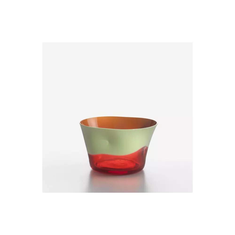 Bowl Orange - green pea Orange and green pea bowl in Murano glass, handmade and with the aid of molds, inside which the masters NasonMoretti blow the melted material, a mixture created following some secret recipes that go back to the foundation of the factory. A technique developed in 1951 that required a squashing of the glass, which adapts to the hand and has distinctive ergonomics, makes it even more original. For this reason, every Dandy is a unique piece. DIMENSIONS: H 7 cm, diameter 12 cm