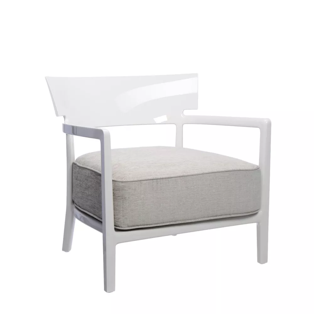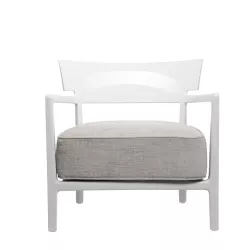 Armchair Cara Fireproof, Ivory and Beige. Structure Material: Mass-Colored Polycarbonate Seat Material: Padded with polyurethane foam covered in fabric Third Material: Fabric: 59% Viscose, 4% Cotton, 14% Linen, 23% Polyester Use: indoor Dimensions: H 69 cm, W 68 cm, D 67 cm