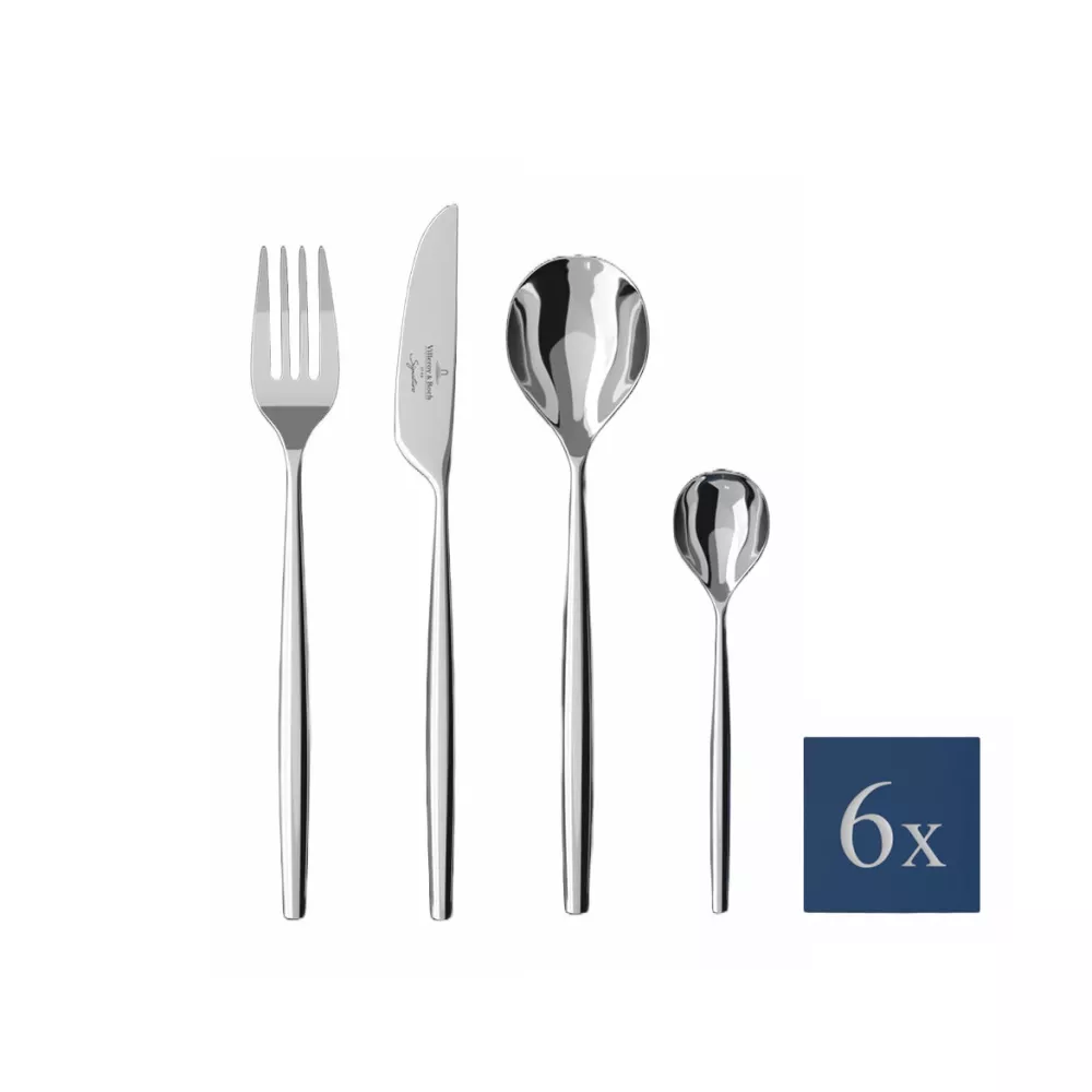 24 PIECES CUTLERY SET, METROCHIC 12-6527-9030 - VILLEROY & BOCH The MetroChic cutlery collection transforms the essence of urban modernity into refined elegance. The slim lines of the design skillfully blend with delicate curves and balanced proportions. This bestows upon these utensils an aura of perfection, making them the ideal complement for the MetroChic dinnerware collection, as well as any other minimalist set for a modern home. The 24-piece table cutlery set for 6 people represents the perfect foundational ensemble for various occasions. Complete your urban MetroChic service with the perfect cutlery set, which includes: 6 table knives 6 table forks 6 table spoons 6 coffee spoons Sku: 1265279030 Stainless steel