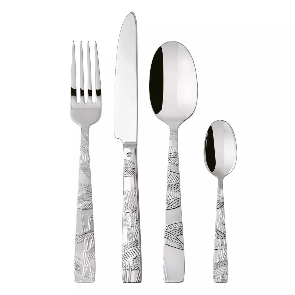 SET OF 24 CUTLERY SET, JUNGLE 52567-81 - SAMBONET Sambonet Jungle is a remarkable project that involves redesigning cutlery to give them a modern and chic appearance. Designer Gianni Cinti has created a fascinating and unparalleled storyline by combining a fork, a spoon, and a knife to form a natural pattern. This unique collection of cutlery has textures that are not affected by wear and tear or time, making them stand out from other cutlery collections on the market. Sambonet Jungle is a contemporary luxury that can make any dining table look special. For those who like to go against the norm and start with the cutlery rather than the plate when decorating the table, this collection offers a unique proposition. Made from high-quality 18/10 stainless steel, these pieces are durable and dishwasher safe. Cutlery set for 6 people includes: 6 knives, 6 forks, 6 tablespoons, and 6 teaspoons, all available as a set only (no individual cutlery pieces available). With Sambonet Jungle, your table decoration will leave a lasting impression on your guests. Material: Inox Steel