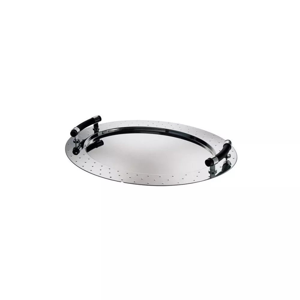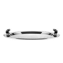 OVAL TRAY WITH HANDLES, MG09 58 CM - ALESSI Alessi Oval tray with handles MG09 Code: MG09 Designer Michael Graves Oval tray in 18/10 stainless steel mirror polished with handles in PA, black. One of the Alessi's greatest trays, it echoes the decorative details of the family of kettles with whistling birds from 1985. Width (cm): 45.50 Length (cm): 58.00