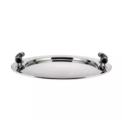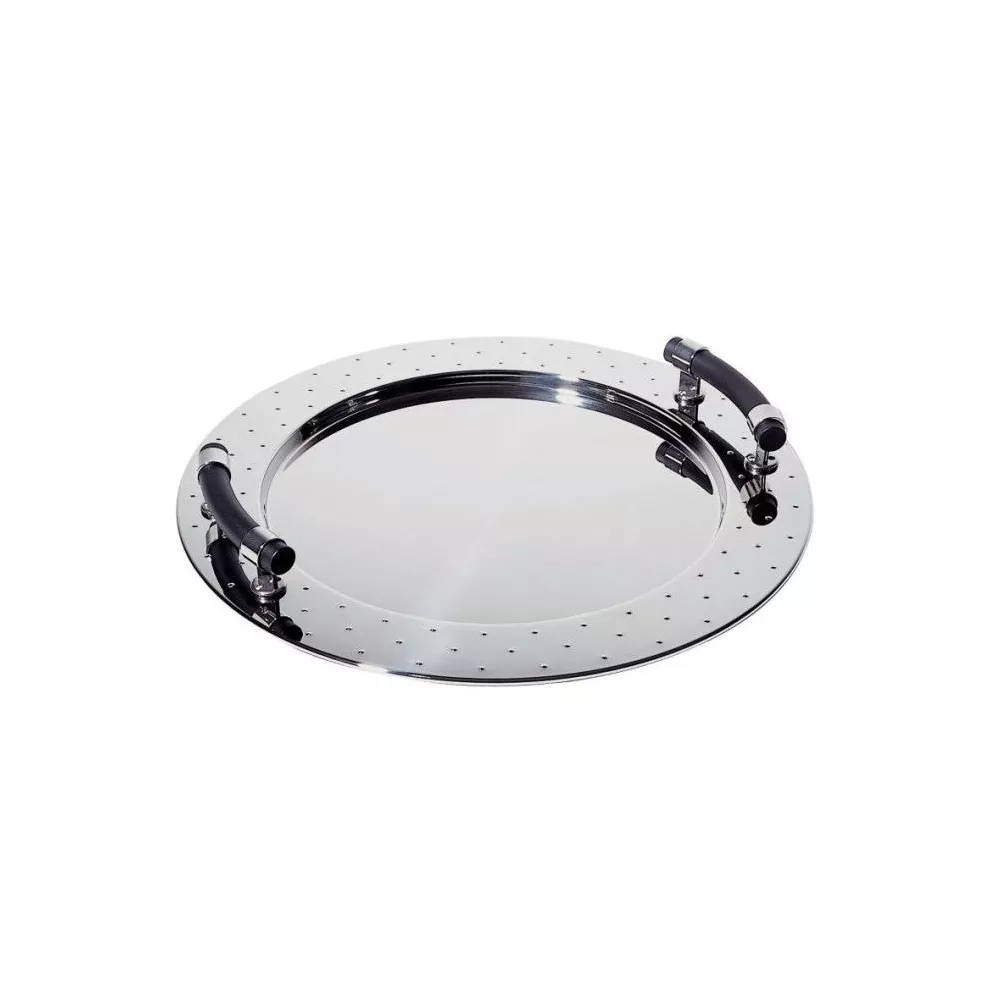 Alessi Round tray with handles Code: MGVASS Designer Michael Graves Round tray in 18/10 stainless steel mirror polished with handles in PA, black. The style reflects the decorative details of the family of the famous kettle with bird of 1985. Diameter (cm): 48.00