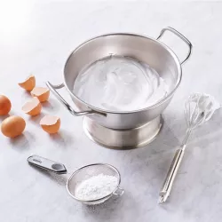 The Paderno mixing bowl base is a functional accessory designed to ensure operational stability and precision during food preparation. Crafted from stainless steel with a satin finish, it provides a secure grip on the work surface, improving control during more vigorous mixing tasks. The satin treatment creates a uniform, softly matte surface that complements the professional aesthetic of the collection. An essential addition to optimize mixing bowl use in both professional kitchens and advanced home cooking.