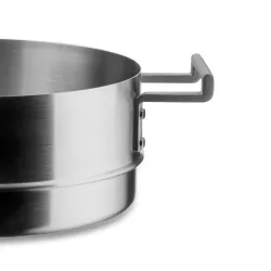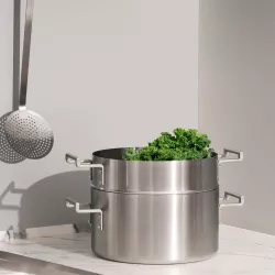 Steam Basket Convivio 24 cm, signed by Alessi in satin-finished trilaminate (AISI 430, aluminum, 18/10 stainless steel). Stainless steel handle with PVD coating. Magnetic steel bottom, also suitable for induction cooktops. The steamer, conceived by David Chipperfield with the consultation of Pietro Leemann, fully embodies in its design the design philosophy of the Pritzker Prize and the culinary culture of the Michelin-starred chef: meticulous attention to detail and an almost monastic simplicity. An essential for every kitchen, available in two different sizes. SKU: DC307 Diameter: 24 cm