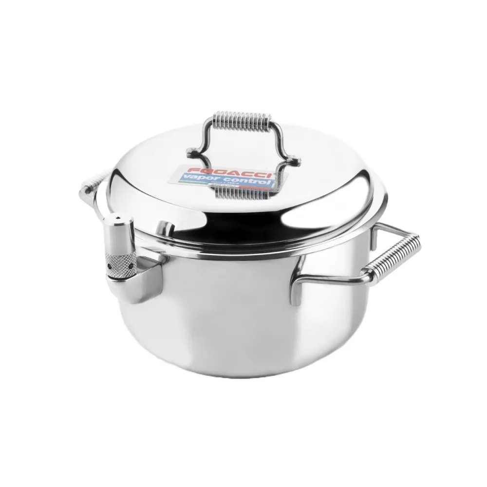 The patented system of FOGACCI® vapor control® involves the use of a double wall made of 18/10 stainless steel that creates a space where steam is formed. Thanks to a special valve, the amount of steam and the temperature inside the pot are regulated to cook food gently and evenly, without the risk of burning. This cooking method allows food to be cooked without direct contact with the heat source, maintaining a constant temperature that never exceeds 105°C. In this way, food is protected from heat alterations and flavors, nutritional principles, and nutritional values remain unchanged. FOGACCI® vapor control® is the ideal choice for a healthy and tasty kitchen, where food quality always comes first.