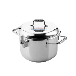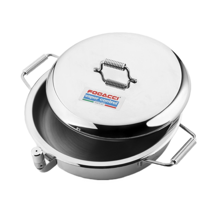 26 CM STEAM SAUCE PAN, VAPOR CONTROL 2000-342 - FOGACCI The patented system of FOGACCI® vapor control® involves the use of a double wall made of 18/10 stainless steel that creates a space where steam is formed. Thanks to a special valve, the amount of steam and the temperature inside the pot are regulated to cook food gently and evenly, without the risk of burning. This cooking method allows food to be cooked without direct contact with the heat source, maintaining a constant temperature that never exceeds 105°C. In this way, food is protected from heat alterations and flavors, nutritional principles, and nutritional values remain unchanged. FOGACCI® vapor control® is the ideal choice for a healthy and tasty kitchen, where food quality always comes first. Sauce pan with lid, 26 cm diameter, 7,8 cm height, 2,8 liter capacity. Made entirely of high-thickness 18/10 stainless steel; The heat of the steam is kept constant by the gravity control valve; The handles are thermally insulated and easy to grip; The bottom has an aluminum diffuser layer, protected by a stainless steel capsule; The lid has a wide condensing surface and helps to maintain a constant degree of food humidity.