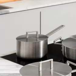 Long-handled satin trilayer casserole (AISI 430, aluminum, 18/10 stainless steel). Stainless steel handle with PVD coating. Magnetic steel bottom, also suitable for induction cooktops. The Long-Handled Casserole, also known as "alla russa," shares the versatility of other casseroles, excelling particularly in the preparation of sauces and gravies. The simple volume of the cylindrical container is juxtaposed with the strong horizontality of the handle: a balanced juxtaposition of geometries and materials. Sku: DC105/16 Diameter: 16 cm Capacity: 180 cl