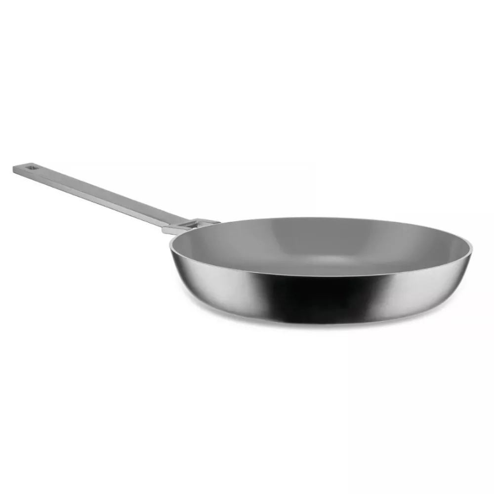 The Convivio frying pan by Alessi, designed by David Chipperfield and Pietro Leeman, blends refined aesthetics with professional performance. Made of tri-ply material (AISI 430, aluminum, and 18/10 stainless steel) with a satin finish, it ensures perfect heat distribution and durability. The ceramic non-stick interior enhances cooking comfort, while the PVD-coated 18/10 stainless steel handle adds a touch of elegance. Suitable for induction cooking and dishwasher safe, it’s a versatile essential for any kitchen.