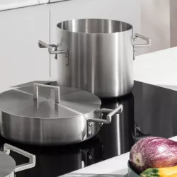 Alessi Convivio satin trilayer pot (AISI 430, aluminum, 18/10 stainless steel). Stainless steel handle with PVD coating. Magnetic steel bottom, suitable for induction stovetops as well. The pot, conceived by David Chipperfield with the guidance of Pietro Leemann, fully embodies the design philosophy of the Pritzker Prize and the culinary culture of the Michelin-starred chef: meticulous attention to detail and an almost monastic simplicity. A must-have for every kitchen, available in two different sizes. SKU: DC100/24 Diameter: 24 cm Capacity: 1000 cl