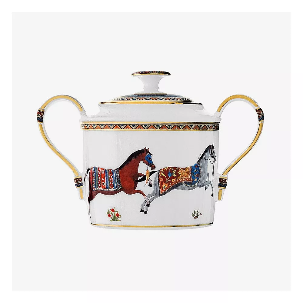 Hermes Cheval D'Orient Sugar Bowl Code: 9820P Joyful horses enjoy their freedom, galloping across the steppe and climbing wooded hills. Resplendent in their gleaming, brightly coloured caparisons, they seem to have only just escaped from a Persian legend. The accompanying floral and multicolour stripe patterns dotted with gold evoke the Silk Road and Eastern hospitality. Capacity: 38 cl Material: porcelain For all Hermès products that are not available at the time of purchase, please consider a delivery time of 6 to over 12 months