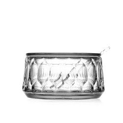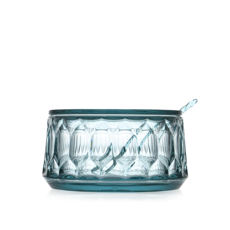 SUGAR BOWL, JELLIES FAMILY, 1583 - KARTELL This line of plates, trays, glasses, bowls, and carafes offers a wide selection of products made from brilliant, colored, and transparent PMMA. What makes this line unique is that each design features a different pattern inspired by nature and organic shapes, reminiscent of traditional molds used for making jellies in kitchens. These patterns highlight the temporality and variety that characterize each stage of the meal, from the initial course to the final one. The delicate, soft, and easily combinable transparent colors allow for setting vibrant tables, whether they be creative and original or more classic and monochromatic. Material COLORED PMMA IN MASS Diameter: 11 cm DISCOVER THE COLLECTION: Jellies Family Kartell