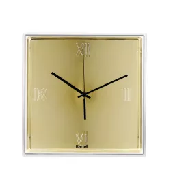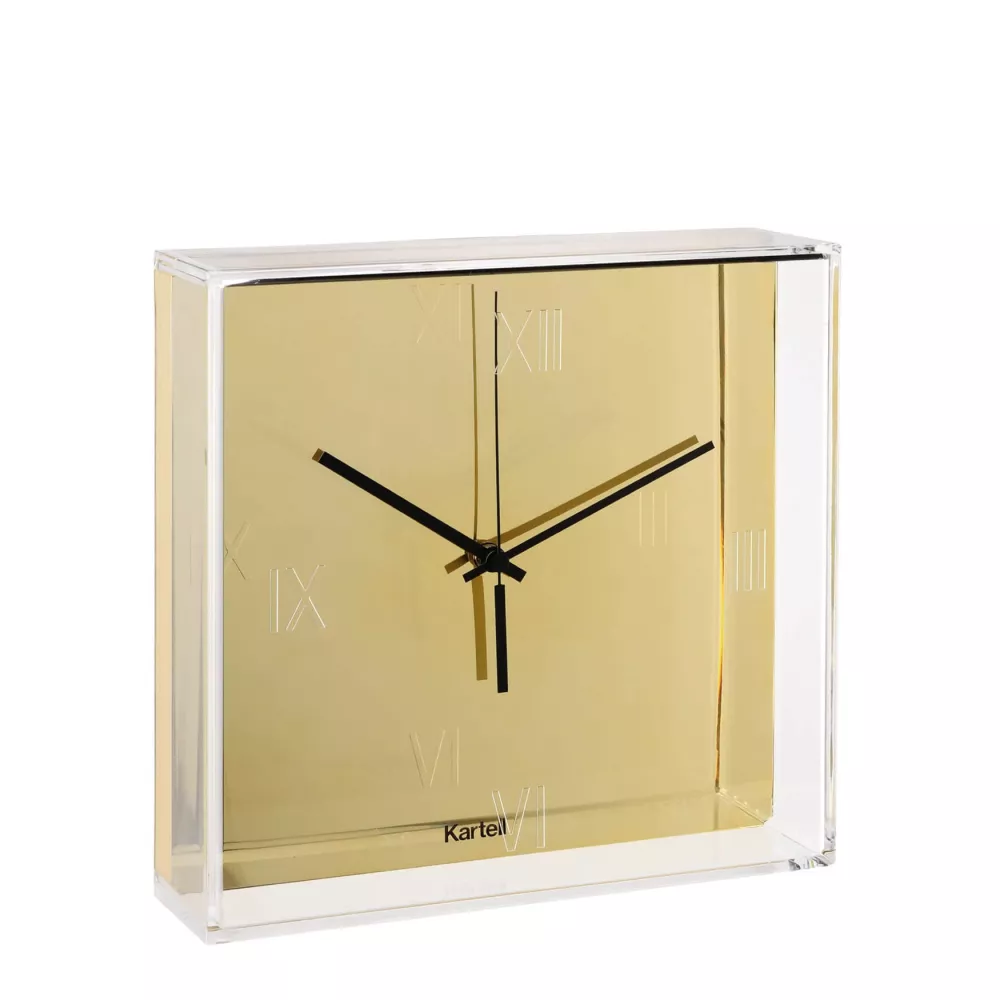 TIC & TAC TABLE AND WALL CLOCK, 1910 - KARTELL Kartell marks the hours and presents its first wall and surface clock. It features a transparent square "box" measuring 30x30 cm, with engraved Roman numerals on the surface. Inside, there is a flat dial that showcases a pair of slender, colored hands, creating a chromatic synthesis that transforms time into an aesthetic experience. Tic & Tac is a clock with substantial thicknesses that create plays of light and reflections. The unmistakable touch of Starck is emphasized by the orange color of the hands, the designer's fetish hue. The dial is available in white and black, or chromed in a range of metallic tones. Width: 30 cm Depth: 8 cm Height: 30 cm