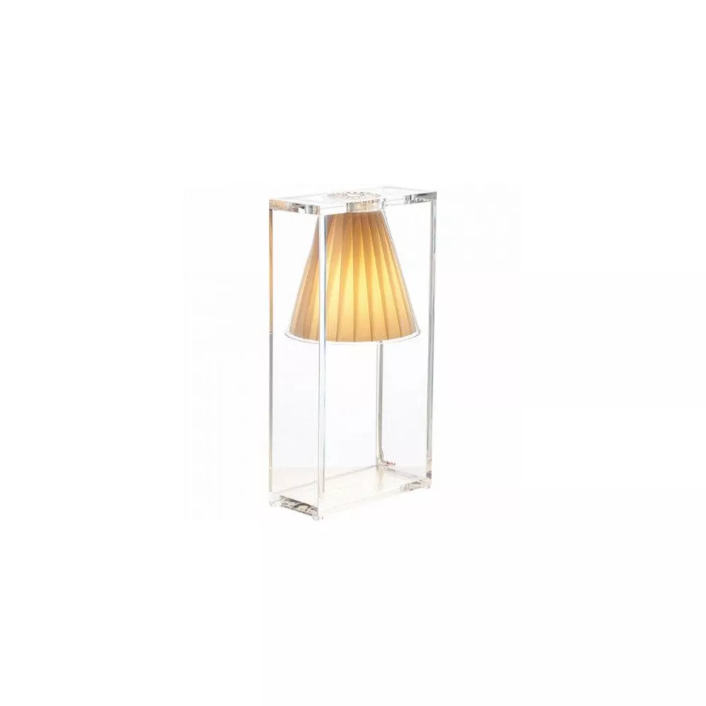 Kartell Light-Air Table Lamp by EUGENI QUITLLET An "illusionist" table lamp, a suspended light that escapes the law of gravity. Light-Air is essential, modern and rational, but at the same time produces a magical effect. Its structure is a strong graphic sign, composed of a rectangular frame in transparent or mass-colored thermoplastic technopolymer, which houses the diffuser inside, a conical parabola with a pleated fabric interior. Material Structure: Transparent Thermoplastic Technopolymer Diffuser: Transparent thermoplastic technopolymer covered in fabric dimensions Width: 17 cm Depth: 7.4 cm Height: 32 cm Unit weight: 1.1 kg