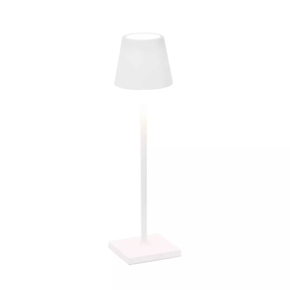 TABLE LAMP POLDINA MICRO - ZAFFERANO SRL Poldina micro is a battery-operated portable and rechargeable table lamp. It is equipped with contact charging base, dimmer touch control and light color temperature selection function: 2200, 2700 & 3000K (dynamic white). In the micro version, the charger is not included. Rechargeable and replaceable lithium battery pack Battery lasts 7-8 hrs at full power Charging time at 1A: 3-4 hrs Die-cast aluminium fixture, polycarbonater diffuser Suitable for outdoor (IP65) Diameter: 7 cm; H 27,5 cm; Base: 7x7 cm