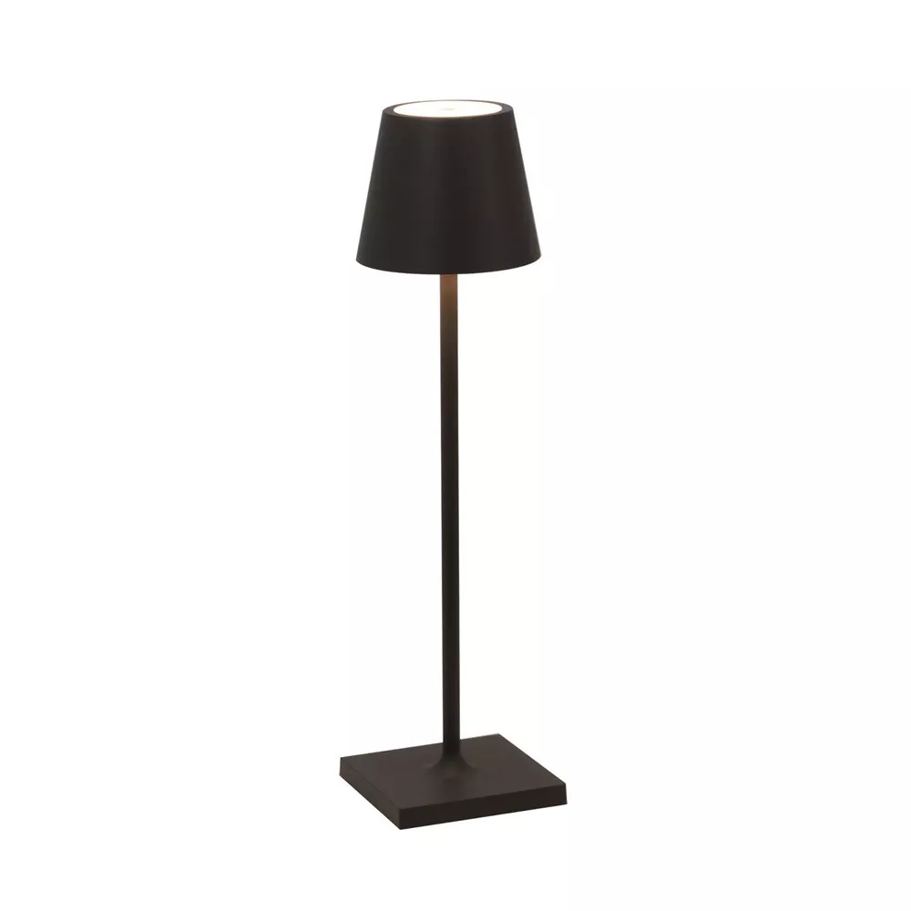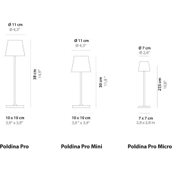 TABLE LAMP POLDINA MICRO - ZAFFERANO SRL Poldina micro is a battery-operated portable and rechargeable table lamp. It is equipped with contact charging base, dimmer touch control and light color temperature selection function: 2200, 2700 & 3000K (dynamic white). In the micro version, the charger is not included. Rechargeable and replaceable lithium battery pack Battery lasts 7-8 hrs at full power Charging time at 1A: 3-4 hrs Die-cast aluminium fixture, polycarbonater diffuser Suitable for outdoor (IP65) Diameter: 7 cm; H 27,5 cm; Base: 7x7 cm