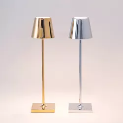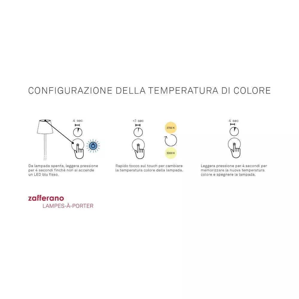 TABLE LAMP POLDINA PRO MICRO - ZAFFERANO SRL Poldina micro is a battery-operated portable and rechargeable table lamp. It is equipped with contact charging base, dimmer touch control and light color temperature selection function: 2200, 2700 & 3000K (dynamic white). Cable and charging base included in the box, In the micro version, the charger is not included. Rechargeable and replaceable lithium battery pack Battery lasts 7-8 hrs at full power Charging time at 1A: 3-4 hrs Die-cast aluminium fixture, polycarbonater diffuser Not suitable for outdoor in this colour version Diameter: 7 cm; H 27,5 cm; Base: 7x7 cm