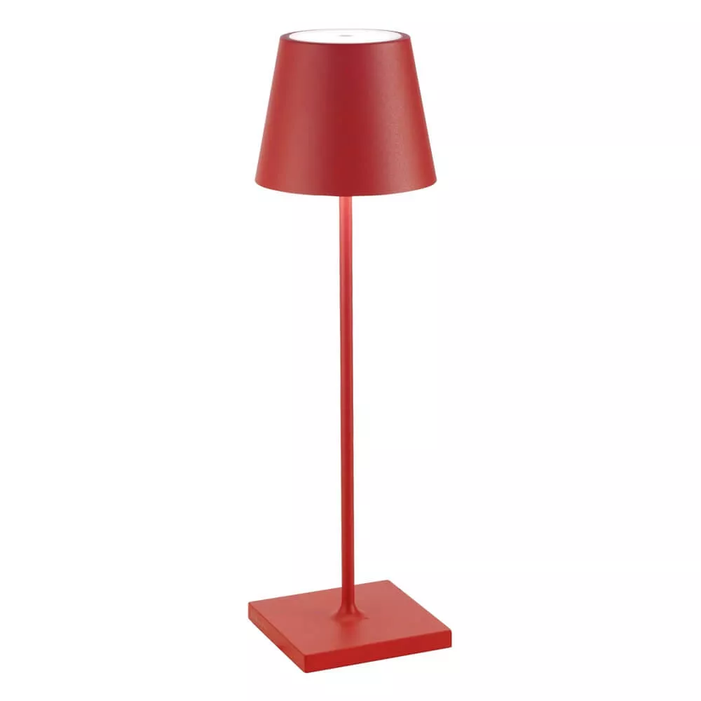 Poldina Pro is a portable, rechargeable table lamp, perfect for both indoor and outdoor use. Featuring a touch control on the top for on/off, light intensity adjustment, and color temperature selection (2700K-3000K). Made from die-cast aluminum with a polycarbonate diffuser, it is durable and convenient, with a contact charging base included.