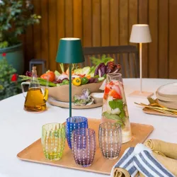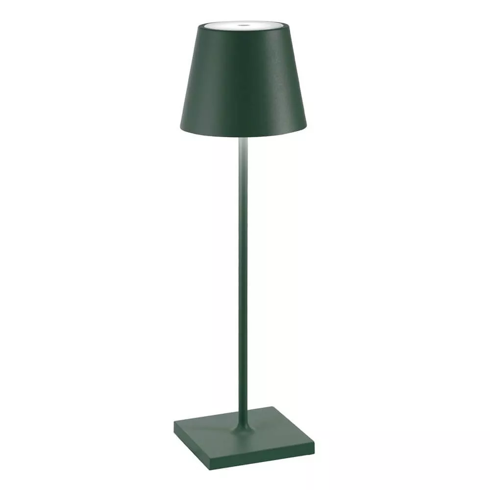 Poldina Pro is a portable, rechargeable table lamp, perfect for both indoor and outdoor use. Featuring a touch control on the top for on/off, light intensity adjustment, and color temperature selection (2700K-3000K). Made from die-cast aluminum with a polycarbonate diffuser, it is durable and convenient, with a contact charging base included.