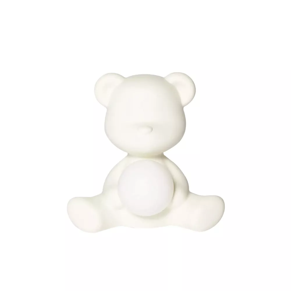 TEDDY GIRL LAMP, RECHARGEABLE LED 25001 - QEEBOO Designed by Stefano Giovannoni, inspired by the traditional teddy bear, Teddy Girl is a wireless and rechargeable table lamp, featuring a small luminous sphere. Timid and delicate, it illuminates the tender soul of the little teddy bear. Material: PE - Polyethylene Dimensions: 35 x 24 x 32 cm Light Source: White LED 4W Battery Life: 6h