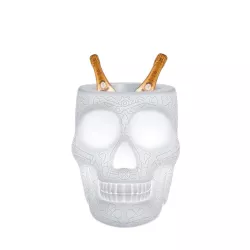 PLANTER / CHAMPAGNE BUCKET LED, MEXICO 70009LED - QEEBOO Mexico, designed by Studio Job, is a skull-shaped lamp with a graphic pattern on the surface, functioning both as a planter for plants and a champagne cooler. Evoking the traditional painted calaveras of the country with the same name, Mexico is a whimsical reminder of the cyclical nature of our presence on Earth, meant to exorcise death and celebrate life. Perfect for lounge areas, dining rooms, and outdoor spaces. Cordless and equipped with a rechargeable battery, LED light, and 16 interchangeable RGB colors, it can be remotely controlled. Material: Polyethylene Light Source: Cordless 8W LED Light Color: 16 colors Light Emission: Diffused Dimensions: 38 x 53 x 45 cm Weight: 3.5 kg Battery Autonomy: 6 hours Light: 16 colors LED / Remote