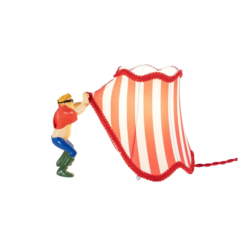 Funny circus-inspired characters are caught up with a lampshade that they mistake for their circus tent. They are eager to show off their skills or strength, so they lift a corner of the lamp/tent, ready to make their entrance. Table lamp Design: Uto Balmoral Material: Resin/Metal/Polyester Dimensions: 26 cm x h.19 | 10.2'' x h. 7.4''